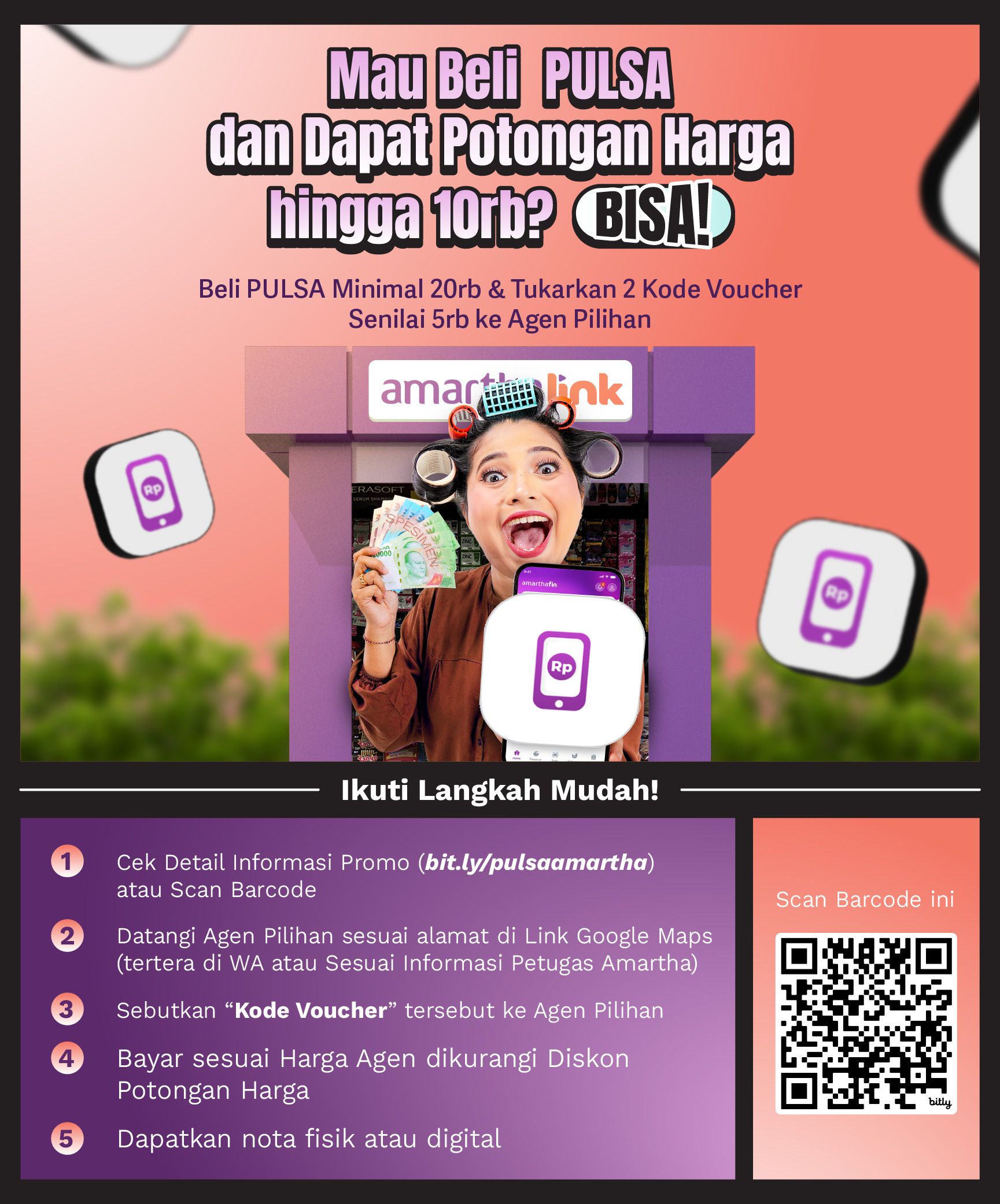 Mau beli pulsa tapi pengen yang cepat, aman, dan pastinya hemat? Tenang, sekarang ada Agen AmarthaLink! Tinggal datang ke agen AmarthaLink yang direkomendasikan Amartha, Ibu sudah bisa transaksi lebih mudah sekaligus nikmati 2 voucher diskon Rp5.000 khusus pembelian pulsa.