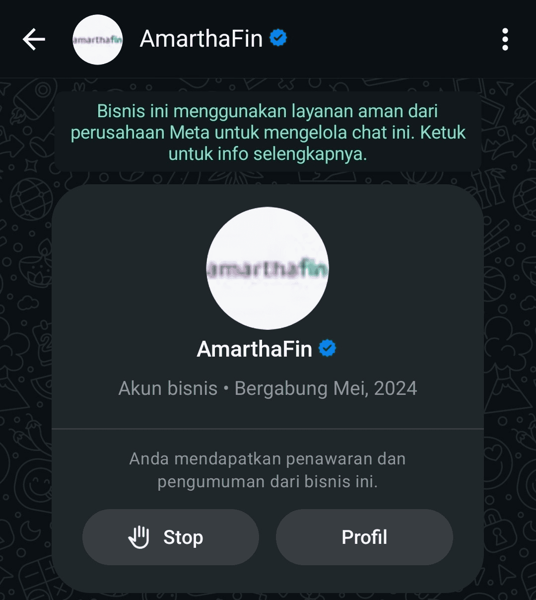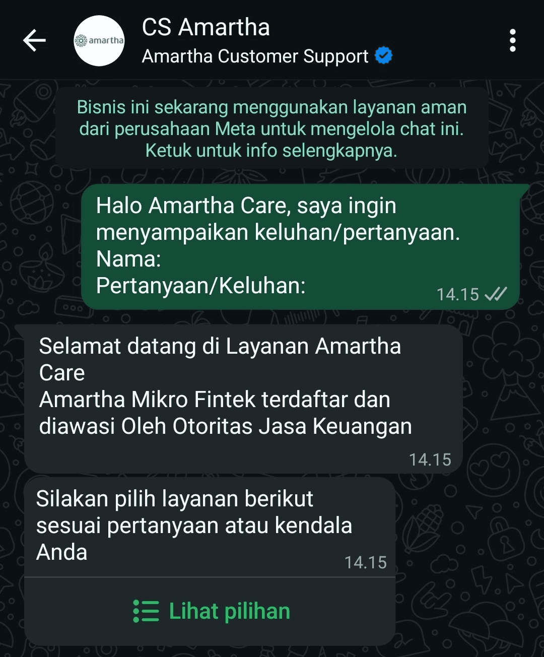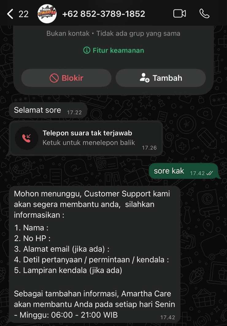 - Mengaku CS Amartha, namun tidak memiliki centang biru resmi (Verified Badge).