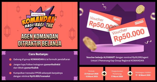 Spesial bulan Ramadhan 1447 H, Amartha menghadirkan program THR KOMANDAN untuk agen AmarthaLink yang terus konsisten melakukan transaksi PPOB seperti Pulsa, Kuota, Bayar Tagihan dan lainya di Aplikasi AmarthaFin. Ada pun ketentuan lain untuk mengikuti program ini: